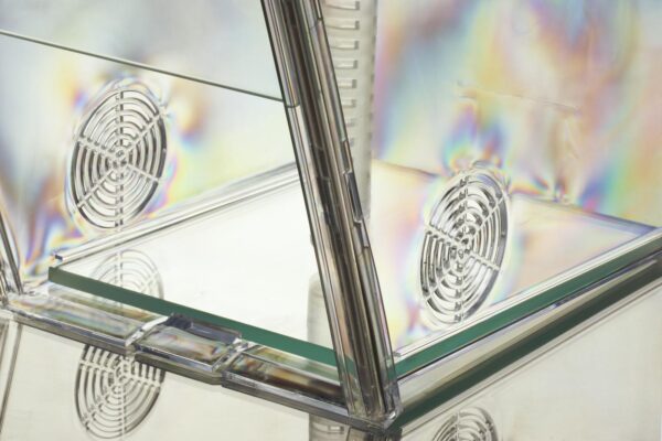 - Door Placement: Insert the glass door into the side rails. The door must be oriented so the larger hole aligns with the door mechanism to function correctly.