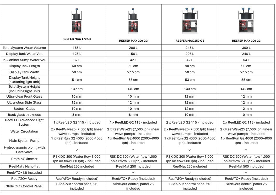All REEFER G3 models come with the ReefATO+ system, which keeps your water volume and salinity stable, and includes an accurate temperature monitor as well as a highly sensitive leak detector.